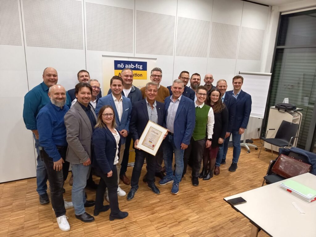 Das Team der NÖAAB-FCG AK Fraktion so wie Nationalratsabgeordneter Lukas Brandweiner nützten bei der fraktionellen Vollversammlung die Gelegenheit, dem, aufgrund seiner Pensionierung kürzlich ausgeschiedenen Kammerrat und Fraktionsvorsitzenden, Harald Sterle für seine langjährige Tätigkeit als Vorsitzender zu danken.